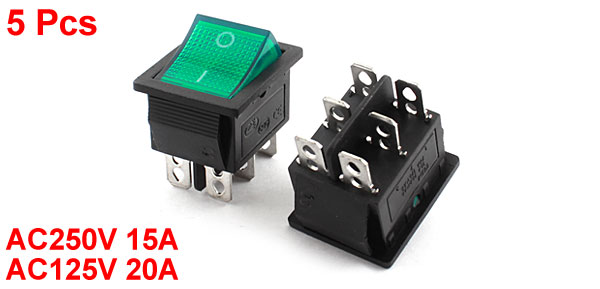 Details5 Pcs AC250V 15A AC125V 20A 2 P Green Light ON/OFF DPDT Boat Rocker Switch  Product Name Rocker Switch Poles DPDT Terminals 6 Pin (ON-OFF) Light Color Green Rating Voltage AC250V 15A / AC125V 20A Total Size 31 x 25 x 35mm / 1.2" x 1" x 1.4"(L* W *T) Mounting Dimension 26 x 21 x 16mm/1.0'' x 0.83'' x 0.63'' (L*W*Depth) Color Black, Silver Tone, Red Material Plastic, Metal Weigth 58g Package Content 5 x Rocker Switch