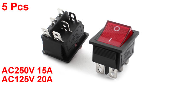 Product Name Rocker Switch Poles DPDT Terminals 6 Pin (ON-OFF) Light Color Red Rating Voltage AC250V 15A / AC125V 20A Total Size 31 x 25 x 35mm / 1.2" x 1" x 1.4"(L* W *T) Mounting Dimension 26 x 21 x 16mm/1.0'' x 0.83'' x 0.63'' (L*W*Depth) Color Black, Silver Tone, Red Material Plastic, Metal Weigth 58g Package Content 5 x Rocker Switch  - Reviews