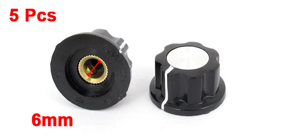 Details5 Pcs Adjustable Turn 19mm Top 6mm Shaft Insert Dia Potentiometer Rotary Knobs  Product Name Potentiometer Knob Cap Material Plastic, Metal Color Silver Tone, Black Knob Top Diameter 19mm/0.75" Shaft Hole Dia. 6mm / 1/4" Overall Size 23mm x 13mm/ 0.91" x 0.51"(D*H) Weight 29g Package Included 5 x Potentiometer Knob