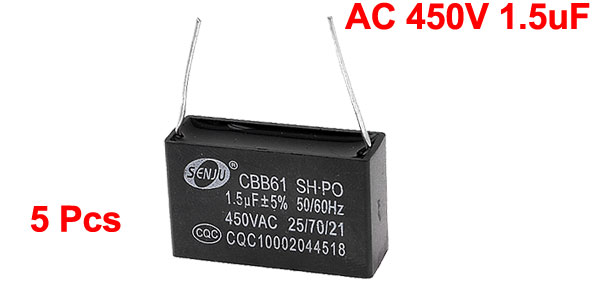 Details5 Pcs Black 450V 1.5uF 2-pin Rectangle Air Conditioner Washing Machine Capacitor  Product Name Air Condition Capacitor Material Polypropylene Film Model CBB61 Rated Capacitance 1.5uF Rated Frequency 50/60 Hz Rated Voltage AC 450V Overall Size 36 x 22 x 10mm / 1.4" x 0.9" x 0.39" (L*W*T) Pin Size 20 x 0.9mm / 0.8" x 0.035" (L*D) Pin Spacing 29mm / 1.1" Main Color Black Net Weight 44g Package Content 5 x Air Condition Capacitor