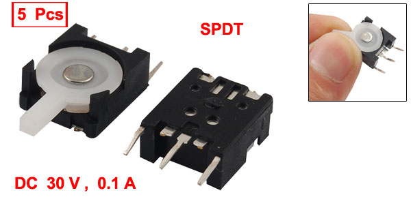 Product Name Reset Switch Working Power DC 30V, 0.1A Action Type SPDT Contact Type ON/OFF/ON, 3 Position Contact Resistance 200M ohm Max Insulation Resistance 500M ohm Min Terminal Quantity 3 Pin Length 4mm/ 0.16" Pin Pitch 5mm/ 0.2" Overall Size 22 x 11 x 5mm/ 0.87" x 0.43" x 0.2"(L*W*H) Material Plastic, Metal Color Black, White Weight 6g Package Content 5 Pcs x Reset Switches - Reviews