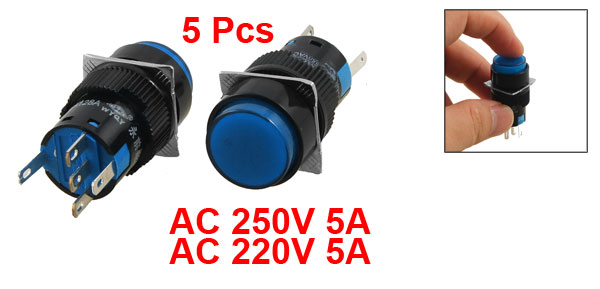Product Name Push Button Switch Action Type Self Locking Contact Type 1 NO, 1NC (SPDT) Switch Voltage Current AC 250V 5A Ith AC 220V 5A Light Voltage DC 24V Terminals Quanlity 5 Pins Mounting Hole Diameter 15.7mm / 0.618" Button Diameter 15.5mm / 0.6" Overall Size 18.5 x 18.5 x 40mm / 0.73" x 0.73" x 1.57"(L*W*H) Material Plastic & Metal Light Color Blue Color Blue & Black Weight 35g Package Content 5 x Push Button Switch - Reviews