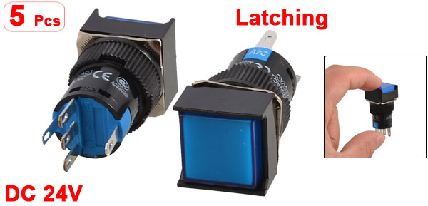 Product Name Push Button Switch Model No. LA128AF-11DZ Action Type Latching Contact Type 1NO, 1NC, SPDT Light Voltage DC 24V Rating Voltage AC 250V 5A Ith AC 220V 5A Light Color Blue Shell Color Black, Blue Terminals Quantity 5 Pins Mounting Hole Diameter 16mm / 0.63" Overall Size (Approx) 17 x 17 x 40mm/ 0.67" x 0.67" x 1.6" (L*W*T) Weight 38g Package Content 5 Pcs x Push Button Switch - Reviews