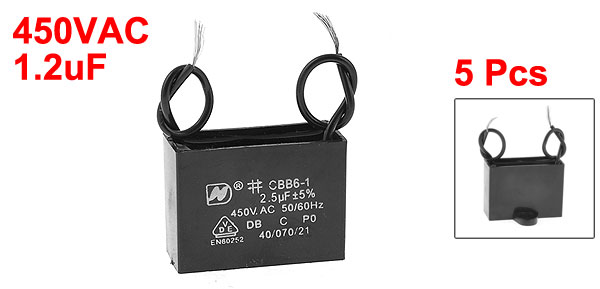 Product Name Run Capacitor Model CBB6-1 Dielectric Material Metallized Polypropylene External Material Plastic Rated Capacitance 1.2uF Tolerance ±5% Rated Frequency 50/60Hz Rated Working Voltage 450VAC Mounting Hole Diameter 4.5mm / 0.17" Boby Size 3.7 x 1.6 x 2.6cm / 1.5" x 0.64" x 1" (L*W*H) Wire Length(Each) 9cm / 3.5" Main Color Black Weight 80g Package Content 5 Pcs x Run Capacitor - Reviews