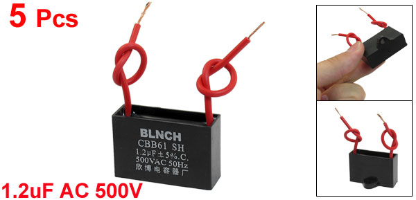 Product Name Motor Capacitor Model CBB61 External Material Plastic Dielectric Material Metalized Polypropylene Film Rated Capacitance 1.2uF Tolerance +/-5% Rated Frequency 50Hz Rated Voltage AC 500V Body Size 3.7 x 1.3 x 2.4cm/ 1.5" x 0.5" x 0.9"(L*W*T) Mount Hole Diameter 4mm/0.16" Cable Length 8cm/ 3.1" Weight 73g Package Content 5 x Motor Run Capacitor - Reviews