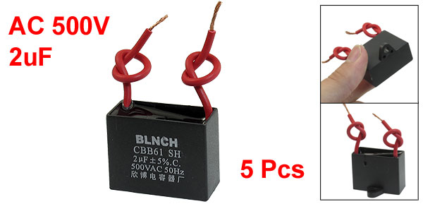 Product Name Motor Capacitor Model CBB61 External Material Plastic Dielectric Material Metalized Polypropylene Film Rated Capacitance 2uF Tolerance +/-5% Rated Frequency 50Hz Rated Voltage AC 500V Body Size 3.7 x 1.7 x 2.9cm/ 1.5" x 0.7" x 1.1"(L*W*T) Mount Hole Diameter 4mm/0.16" Cable Length 7cm/ 2.8" Weight 114g Package Content 5 x Motor Run Capacitor - Reviews