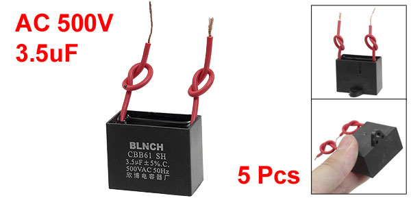 Product Name Motor Capacitor Model CBB61 External Material Plastic Dielectric Material Metalized Polypropylene Film Rated Capacitance 3.5uF Tolerance +/-5% Rated Frequency 50Hz Rated Voltage AC 500V Body Size 3.8 x 2 x 3cm/ 1.5" x 0.8" x 1.2"(L*W*T) Mount Hole Diameter 4mm/0.16" Cable Length 7cm/ 2.8" Net Weight 148g Package Content 5 x Motor Run Capacitor - Reviews