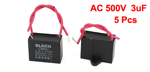 Product Name Motor Capacitor Model CBB61 External Material Plastic Dielectric Material Metalized Polypropylene Film Rated Capacitance 3uF Tolerance +/-5% Rated Frequency 50Hz Rated Voltage AC 500V Body Size 37 x 28 x 17mm / 1.5" x 1.1" x 0.7" (L*W*T) Mount Hole Diameter 4mm/0.16" Cable Length 8cm/ 3.1" Net Weight 150g Package Content 5 x Motor Run Capacitor - Reviews