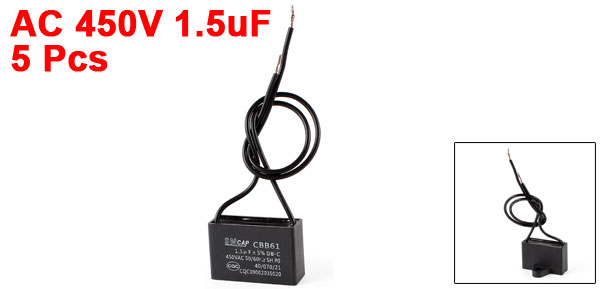 Product Name Motor Capacitor Housing Material Plastic Dielectric Material Metalized Polypropylene Model CBB61 Capacitance 1.5uF Tolerance ±5% Rated Voltage 400VAC Frequency 50/60Hz Temperature Range 40/070/21 Body Size 3.6 x 2.4 x 1.3cm / 1.4" x 0.94" x 0.5" (L* W * T) Wire Length(Approx.) 17cm /6.7" Color Black Weight 90g Package Content 5 x Motor Capacitor - Reviews