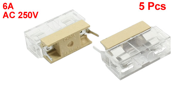 Product Name PCB Fuse Holder Fit for Fuse 5 x 20mm Rated Current 6A Rated Voltage AC 250V Total Size 26 x 10 x 21mm/1" x 0.4" x 0.83" (L*W*H) Material Plastic & Metal Color Beige & Clear Weight 14g Package Content 5 x PCB Fuse Holder - Reviews