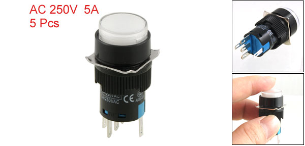 Item Name Push Button Switch Contact Type 1NO, 1NC Switch Type Momentary Switch Working Voltage AC 250V, 5A Lamp Voltage DC 24V Thermal Current(Ith) AC 220V 5A Lamp Cap Color White Switch Color Black, White Pin Number 5 Button Cap Diameter 15mm/ 0.59" Mounting Thread Dia. 16mm/ 0.63" Total Size 18 x 18 x 41mm/ 0.71" x 0.71" x 1.6"(L*W*H) Material Plastic, Electronic Parts Weight 35g Package Content 5 x Push Button Switch - Reviews