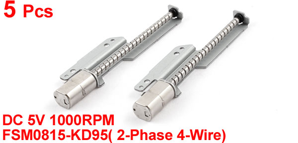 Product Name Stepper Motor Rated Voltage DC 5V Rated Speed 1000RPM Type FSM0815-KD95( 2-Phase 4-Wire) Step Angle 22.5 Degree Pulse 16 Pulses Stepper Motor Size 6x7.5x13.5mm/0.24" x 0.29" x 0.53"(L*W*H) Screw Diameter 2.5mm/0.1" Screw Length 43mm/1.7" Material Metal Color Silver Tone Weight 33g Package Content 5 x Stepper Motor