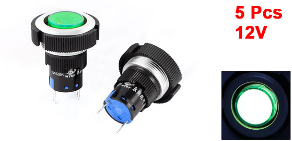 Details5 Pcs DC12V 22mm Diameter Thread Panel Mounting Green Signal Indicator Light  Product Name Signal Indicator Light Light Voltage DC 12V Light Color Green Pins 2 Pin Pitch 11mm/0.43" Mounting Hole Diameter 22mm/0.9" Total Size(Not Included Pin) 29 x 33mm/ 1.2" x 1.3" (D*L) Material Plastic, Electric Components Color Black, Green, Silver Tone Net Weight 56g PakcageContent 5 Pcs x Signal Indicator Light
