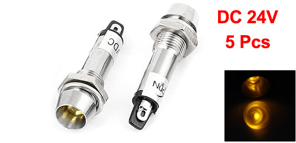 Details5 Pcs DC24V 8mm Thread Yellow Bulb Power Signal Indicator Pilot Light Lamp  Product Name Indicator Pilot Light Voltage DC 24V Pin Number 2 Light Color Yellow Thread Diameter 8mm / 0.31" Material Plastic, Electric Components, Metal Size 11 x 36mm / 0.43" x 1.4"(D*H) Weight 26g PakcageContent 5 Pcs x Indicator Pilot Light