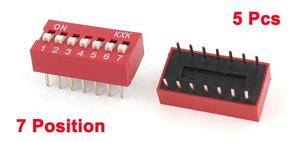 Product Name DIP Switch Type Slide Type Poles 7 Position 14Pin (2Row) Pitch 2.54mm Non-Switching Rating 100mA DC 50V Switching Rating 100mA DC 24V Dimension 19 x 10 x 10mm/ 0.75" x 0.39" x 0.39"(L*W*H) Material Plastic, Electric Parts Main Color Red, Gold Tone,White Weight 18g Package Content 5 Pcs x DIP Switches - Reviews