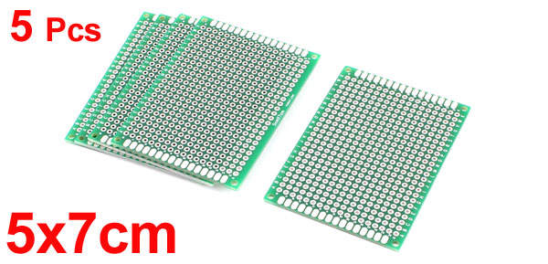 Details5 Pcs Double Side Prototype PCB Tinned Universal Breadboard 5x7cm FR4  Product Name Universal PCB Board Hole Dia(Approx) 1mm / 0.039" Hole Pitch(Approx) 2.54mm / 0.1" Size(Approx) 5 x 7cm /2" x 2.8"(W*L) Thickness(Approx) 1.6mm / 0.063" Install Hole Dia 2mm/0.08" Install Hole Distance 6.6 x 4.6cm/2.6" x 1.8"(L*W) Material FR-4, Tin Color Green, Silver Tone Net Weight 52g Package Content 5 x Universal PCB Board