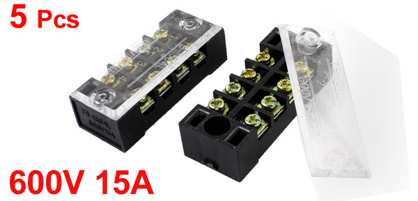 Product Name Barrier Terminal Block Material Metal , Plastic Rated Value 600V 15A Poles 4P (Dual Row) Size 5.5 x 2.2 x 1.6cm / 2.2" x 0.9" x 0.6" (L*W*H) Color Black , Bronze Tone, Clear Weight 91g Package Content 5 x Barrier Terminal Block - Reviews