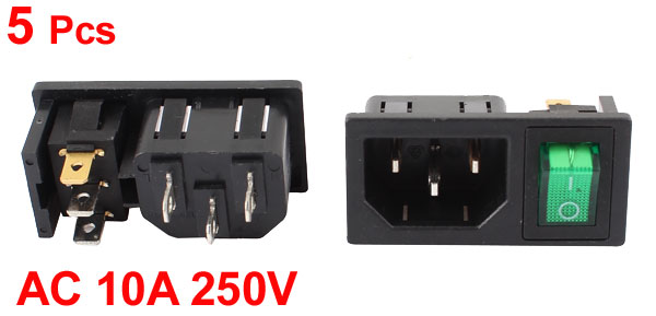 5 Pcs Green Lamp Panel Mount Rocker Switch IEC320 C14 Power Socket AC 10A 250V