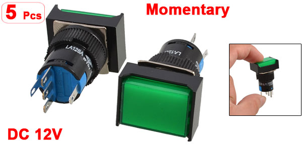 Product Name Push Button Switch Model No. LA128AJ-11D Action Type Momentary Contact Type 1NO, 1NC, SPDT Light Voltage DC 12V Rating Voltage AC 110V 5A Ith AC 110V 5A Shell Color Black, Green, Blue Terminals Quantity 5 Pins Mounting Hole Diameter 16mm / 0.63" Overall Size (Approx) 23 x 18 x 40mm/ 0.9" x 0.7" x 1.6" (L*W*T) Weight 40g Package Content 5 Pcs x Push Button Switch - Reviews