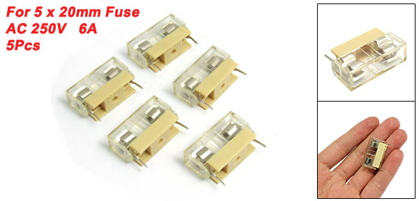 Product Name PCB Fuse Holder Model XS-1033-1 Fit for Fuse 5 x 20mm Rated Current 6A Rated Voltage AC 250V Total Size 26 x 9 x 20mm/1.02'' x 0.35'' x 0.79'' (L*W*H) Material Plastic & Metal Color Beige & Clear Net Weight 15g Package Content 5 x PCB Fuse Holder - Reviews