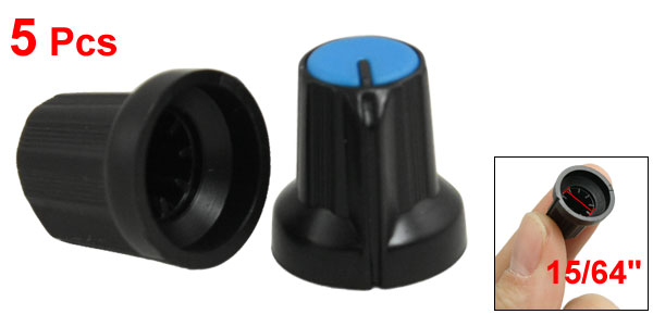 Details5 Pcs Knurled Grip 6mm Shaft Hole Dia Potentiometer Knobs Black Blue  Product Name Potentiometer Control Knob Knob Top Diameter 10mm / 0.39" Knob Base Diameter 15mm / 0.59" Shaft Insert Diameter 6mm / 15/64" Knob Total Height 15.5mm / 0.61" Material Plastic Main Color Black, Blue Weight 9g Package Included 5 x Potentiometer Control Knob