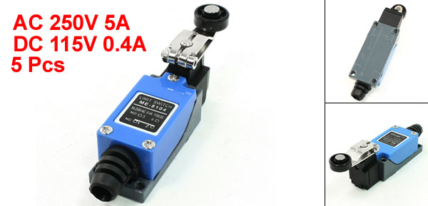 Product Name Limit Switch Model No. ME-8104 Actuator Action Momentary Actuator Type Rotary Adjustable Lever Arm with Roller Contact Configuration 1NC + 1NO(SPDT) Voltage Rating AC 250V 5A DC 115V 0.4A Roller Dimension 1.8 x 0.7cm / 0.7" x 0.3"(D*H) Lever Arm Length 5cm / 2" Fixing Thread Diameter 0.4cm / 0.2" Total Size 12.3 x 5 x 2.8cm / 4.8 x 2 x 1.1"(L*W*H) Material Resin, Plastic & Metal Color Blue, Gray & Black Net Weight 408g Package Content 5 x Limit Switch - Reviews