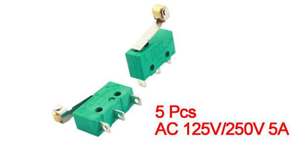 Product Name Micro Limit Switch Model No. KW4-3Z-3 Terminals 3 Pin Terminal Actuator Action Momentary Actuator Type Short Roller Hinge Lever Contact Configuration 1NO,1NC(SPDT) Rate Voltage AC 125V/250V 5A Roller Diameter 4mm/ 0.16" Fixing Holes Dia. 2mm / 0.08" Switch Body Size 20 x 7 x 10cm /0.78" x 0.27"x 0.39"(L*W*H) Level Length 1.5cm/ 0.6" Color Green Net Weight 14g Package Content 5 x Micro Limit Switch - Reviews