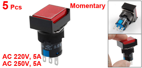5 Pcs Momentary 1NO 1NC 3 Pin Rectangle Push Button Switch Red AC 250V 5A