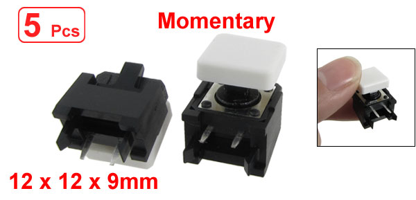 Product Name Tact Switch Contact Type Momentary Contact Dimension 12 x 12 x 9mm / 0.47" x 0.47" x 0.35"(L*W*H) Button Size 11 x 11 x 3mm/ 0.43" x 0.43" x 0.12"(L*W*H) Pin Pitch 5mm/ 0.2" Pin Length 5mm/ 0.2" Material Plastic, Metal, Electric Parts Color Black, Silver Tone, White Net Weight 9g Package Content 5 Pcs x Tact Switches - Reviews