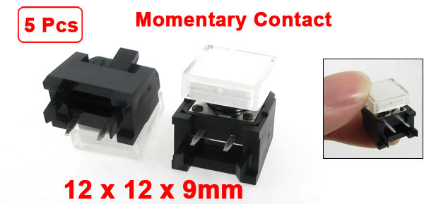 Details5 Pcs Momentary Tact Push Button Switch Right Angle 2 Pin 12 x 12mm x 9mm + Cap  Product Name Tact Switch Contact Type Momentary Contact Dimension 12 x 12 x 9mm / 0.47" x 0.47" x 0.35" (L*W*H) Button Size 11 x 11 x 4mm/ 0.43" x 0.43" x 0.16"(L*W*H) Pin Pitch 5mm/ 0.2" Pin Length 5mm/ 0.2" Material Plastic, Metal, Electric Parts Color Black, Silver Tone, White Net Weight 9g Package Content 5 Pcs x Tact Switches