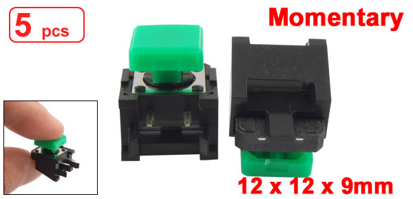 Product Name Tact Switch Contact Type Momentary Dimension 12 x 12 x 9mm/ 0.47" x 0.47" x 0.35" (L*W*H) Overall Size 18 x 13 x 16mm/ 0.7'' x 0.51'' x 0.63'' (L*W*H) Button Dia. 10mm/ 0.39" Pin Pitch 5mm/ 0.2" Pin Length 5mm/ 0.2" Material Plastic, Metal, Electric Parts Color Green, Silver Tone Net Weight 8g Package Content 5 x Tact Switches - Reviews
