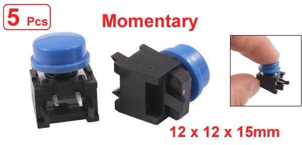 Product Name Tact Switch Action Type Momentary Switch Size 12 x 12 x 15mm / 0.47" x 0.47" x 0.59" (L*W*H) Button Size 8 x 11mm/ 0.31" x 0.43"(H*D) Pin Spacing 5mm/0.19" Pin Size 5 x 1mm/ 0.19" x 0.03"(L*W) Material Plastic, Metal, Electric Parts Main Color Blue, Black Net Weight 8g Package Content 5 x Tact Switches - Reviews