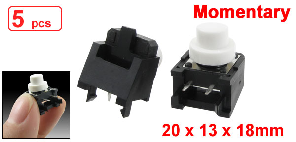 Product Name Momentary Tactile Switch Action Type Momentary Switch Size(Include Cap) 12 x 12 x 13mm/ 0.47" x 0.47" x 0.51" (L*W*H) Dimension 20 x 13 x 18mm / 0.79" x 0.51" x 0.71" (L*W*H) Button Diameter 6mm / 0.24" Pin Pitch 5mm/ 0.2" Pin Length 5mm / 0.2" Material Plastic, Metal, Electric Parts Main Color Black, White Net Weight 8g Package Content 5 x Momentary Tactile Switch - Reviews