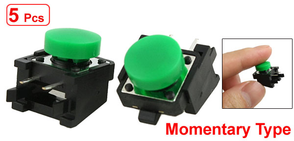 Product Name Tact Switch Contact Type Momentary Dimension 12 x 12 x 8mm/ 0.47" x 0.47" x 0.31" (L*W*H) Overall Size 18 x 13 x 14mm/ 0.7'' x 0.51'' x 0.55'' (L*W*H) Button Dia. 10mm/ 0.39" Pin Pitch 5mm/ 0.2" Pin Length 4mm/ 0.16" Material Plastic, Metal, Electric Parts Color Black, Silver Tone Net Weight 8g Package Content 5 x Tact Switches - Reviews