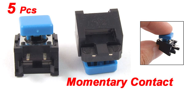 Product Name Tact Switch Contact Type Momentary Contact Size 12 x 12 x 9mm/0.47" x 0.47" x 0.35" (L*W*H) Overall Size 19 x 13 x 16mm/0.7'' x 0.5'' x 0.6'' (L*W*H) Button Size 10 x 10mm/0.39'' x 0.39'' (L*W) Pin Pitch 5mm/0.2'' Pin Length 5mm/0.2'' Material Plastic, Metal, Electric Parts Color Black, Blue Net Weight 7g Package Content 5 x Tact Switch - Reviews