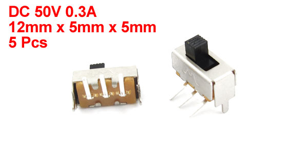 Product Name Slide Switch Position 2 Terminal Number 3 Pin Contact Type SPDT, on/off Rating DC 50V, 0.3A Body Size 12 x 5 x 5mm (L*W*H) Material Plastic, Metal Color Black, Silver Tone Total Weight 15g Package 5 x Slide Switch - Reviews