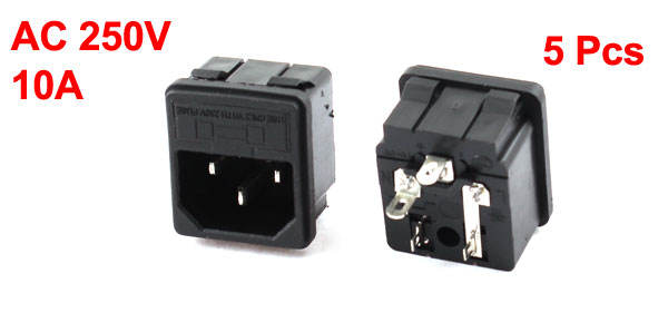 Details5 Pcs Panel Mounted 4 Pin C14 Inlet Male Power Plug 10A AC 250V  Product Name Male Power Socket Power Supply AC 10A 250V Inlet Plug Type IEC 320 C14 Terminals Number 4 Total Size(Approx) 33 x 30 x 30mm/ 1.3" x 1.2" x 1.2" (L*W*T) Fit for Fuse Size 20 x 5mm / 0.78" x 0.19" (L*D) Mouting Hole 32 x 28mm / 1.25" x 1.1" (L*W) Material Plastic , Electronic Parts Color Black Weight 73g Package Content 1 x Male Power Plug