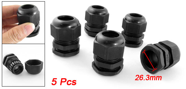Details5 Pcs PG21 Black Plastic Waterproof Cable Glands Joints  Product Name Cable Gland Model PG21 Degree of Protection IP67 (Water Proof) Cable Range 13-18mm / 0.51"- 0.7" Thread O.D. 26.3mm / 1“ Thread Length 12mm / 0.47” Total Size 32 x 44mm / 1.3" x 1.7" (D*H) Material Plastic Color Black Weight 97g Package Content 5 x Cable Gland