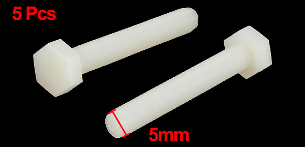 Product Name Hexagonal Head Screw Type Hexagonal Head Thread Diameter 5mm /1/5" Thread Length 40mm / 1.57" Overall Size 44 x 11mm /1.7" x 0.43" (L* Max.Dia) Material Plastic Color Off White Net Weight 7g Package Content 5 Pcs x Hexagonal Head Screws - Reviews