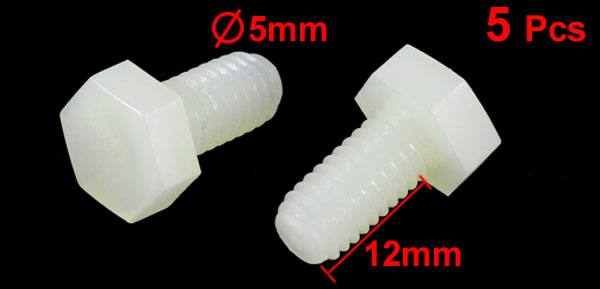 Product Name Hexagonal Head Screw Type Hexagonal Head Thread Diameter 5mm /1/5" Thread Length 12mm / 0.47" Overall Size 15 x 11mm /0.59" x 0.43" (L* Max.Dia) Material Plastic Color Off White Net Weight 4g Package Content 5 Pcs x Hexagonal Head Screws - Reviews