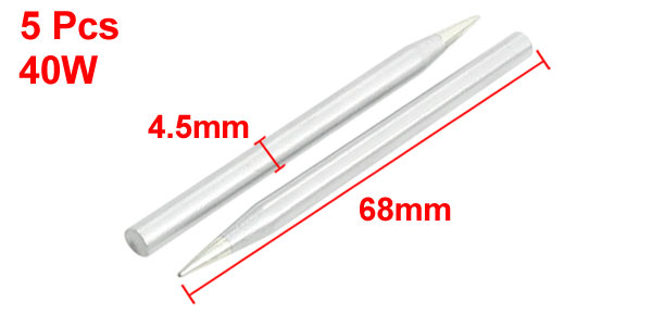 Product Name Soldering Iron Tip Material Metal Power 40W Design Point Total Length 68mm/2.7" Shank Diameter 4.5mm/0.18" Color Silver Tone Weight 46g Package Content 5 Pcs x Soldering Iron Tip - Reviews