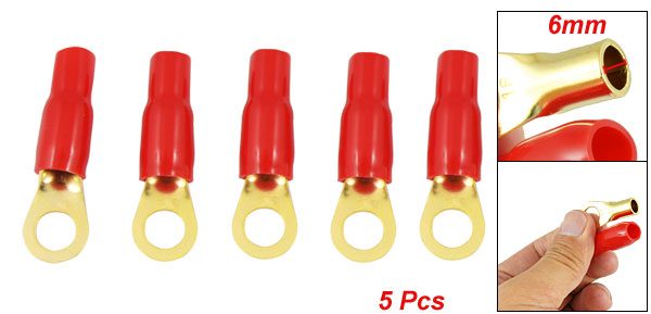 Product Name Insulated Crimp Terminal Type Ring Tongue Type Ring Diameter 8 x 14mm/ 0.31" x 0.55" (ID*OD) Tube Hole Diameter 6mm/ 0.24" Size ( not include insulator) 29 x 14 x 9mm/ 1.14" x 0.55" x 0.35" (L*W*D) Color Gold Tone & Red Material Metal & PVC Plastic Weight 24g Package 5 x Insulated Crimp Terminal - Reviews