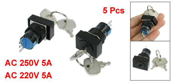 5 Pcs Rectangular 1NO 1NC SPDT 16mm Keylock Selector Push Button Switch 250V 5A