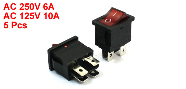 Product Name Rocker Switch Action DPST Terminals 4 Pin (ON-OFF) Light Color Red Rating Voltage 6A 250VAC 10A 125VAC Total Size 2.1 x 1.5 x 2.1cm/0.8" x 0.59" x 0.8"(L* W *T) Mounting Dimension 2.1 x 1.3cm/0.8" x 0.51"(L*W) Color Black, Red, Silver Tone Material Plastic & Metal Total Weight 22g Package Content 5 x Rocker Switch - Reviews