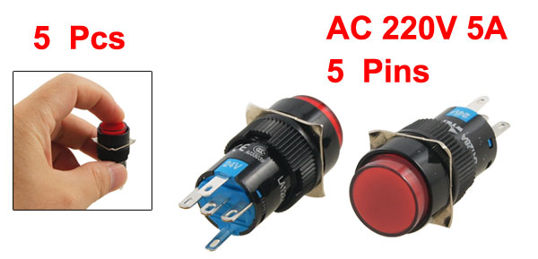 Product Name Push Button Switch Action Type Self Locking Contact Type 1 NO, 1NC (SPDT) Switch Voltage Current AC 250V 5A Ith AC 220V 5A Light Voltage DC 24V Light Color Red Terminals Quanlity 5 Pins Mounting Hole Diameter 15.7mm / 0.618" Button Diameter 15.5mm / 0.6" Overall Size 18.5 x 18.5 x 40mm / 0.73" x 0.73" x 1.57"(L*W*H) Material Plastic & Metal Color Red & Black Weight 35g Package Content 5 x Push Button Switch - Reviews