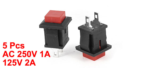 Item Name Push Button Switch Control Type Momentary Voltage AC 250V 1A /125V 2A Main Color Red, Black Pin Pitch 6.9mm / 0.27" Button Size 0.9 x 0.9cm/ 0.3" x 0.3" (L*W) Total Size 1.4 x 1.4 x 2.5cm/ 1" x 0.55" x 0.55" (L*W*T) Material Plastic, Electric Parts Net Weight 13g Package Content 5 x Push Button Switch - Reviews