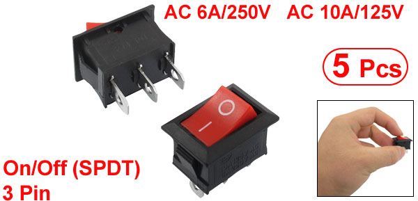 Item Name Rocker Switch Type On/Off (SPDT) Terminals 3 Pin Voltage & Current AC 6A/250V, AC 10A/125V Overall Size ~21 x 15 x 24cm / 0.8" x 0.6" x 0.9"(L*W*T) Mounting Hole Size 19 x 12.1mm / 0.75" x 0.48"(L*W) Color Black, Red Material Plastic & Metal Total Net Weight 19g Package Content 5 x Rocker Switch - Reviews