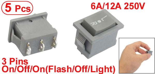Product Name Rocker Switch Type On/Off/On(Flash/Off/Light) Terminals Quantity 3 Pins Rating Voltage 6A/12A 250V Mounting Hole Size 19 x 12mm / 0.75" x 0.47"(L*W) Overall Size 21 x 15 x 23mm / 0.83" x 0.6" x 0.9"(L*W*H) Color Gray Material Plastic & Metal Total Weight 19g Package Content 5 x Rocker Switch - Reviews