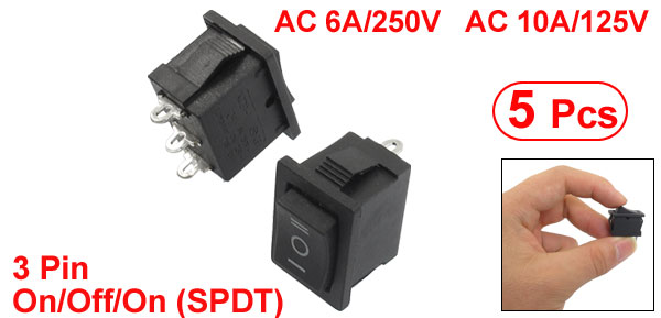 Product Name Rocker Switch Type On/Off/On (SPDT) Terminals 3 Pin Rating Voltage AC 250V 6A, AC 125V 10A Total Size(Each) 21 x 15 x 21mm/ 0.9" x 0.6" x 0.9" (L*W*T) Mount Hole Size 19 x 12mm / 0.75" x 0.47"(L*W) Color Black Material Plastic & Metal Total Weigh 21g