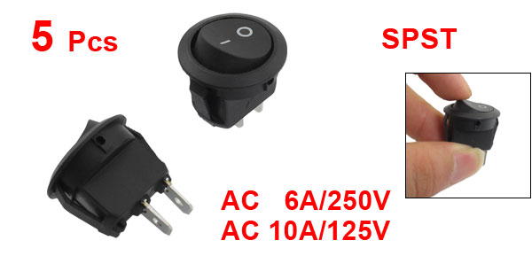 5 Pcs SPST Black Button On/Off Round Rocker Switch AC 6A/250V 10A/125V